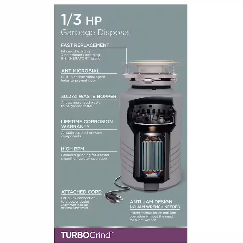 TurboGrind 1/3 hp. Continuous Feed Garbage Disposal with Power Cord